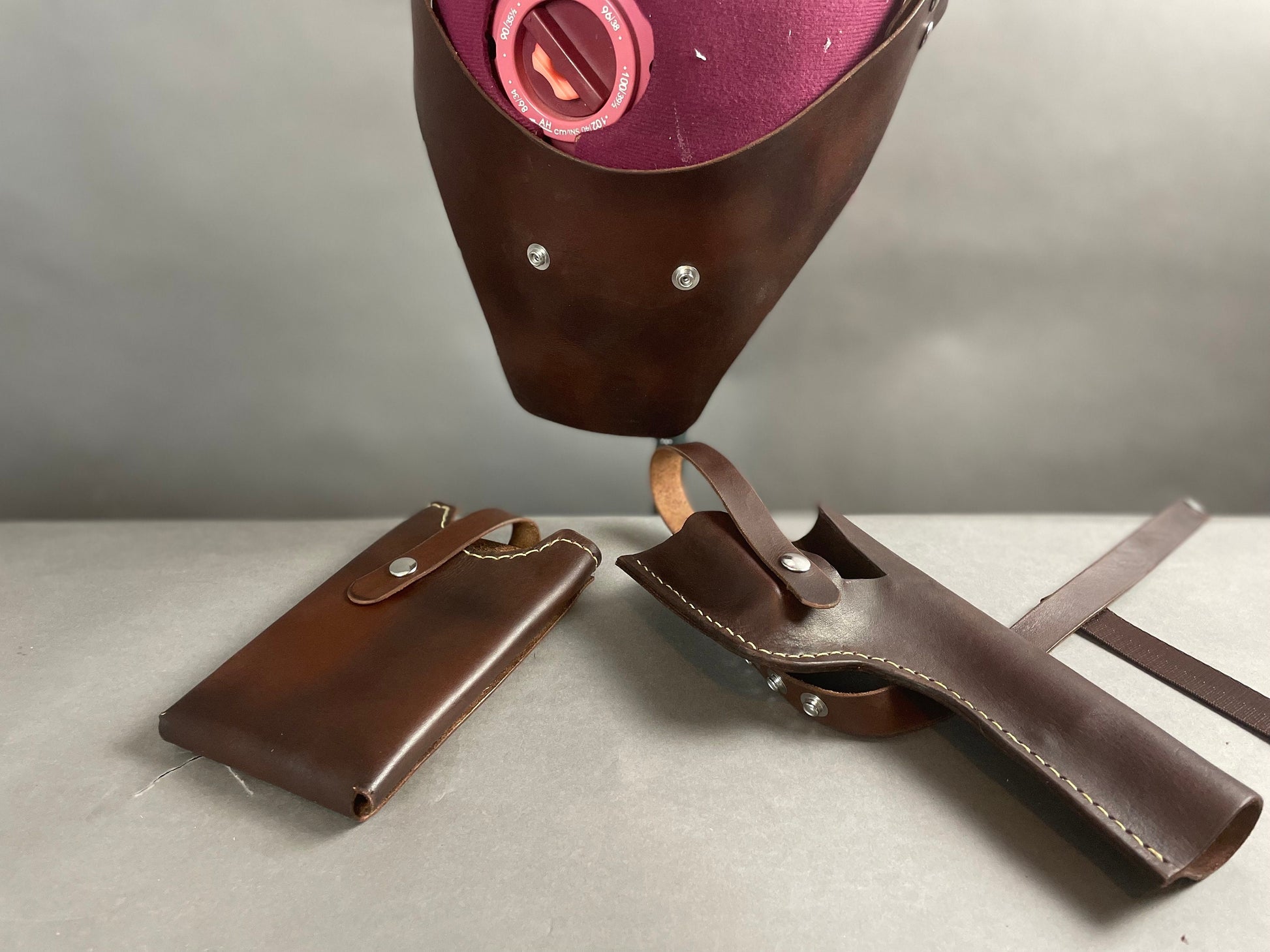Base belt includes the thicker code disk, hidden attachment of the clips that hold the front buckle, light stitching thread, and most noticeably buckles that are larger than those seen in the OT. The metal buckle hardware and code disk is made by me. The Droid Caller Clip which I source from Corellian Drygoods.