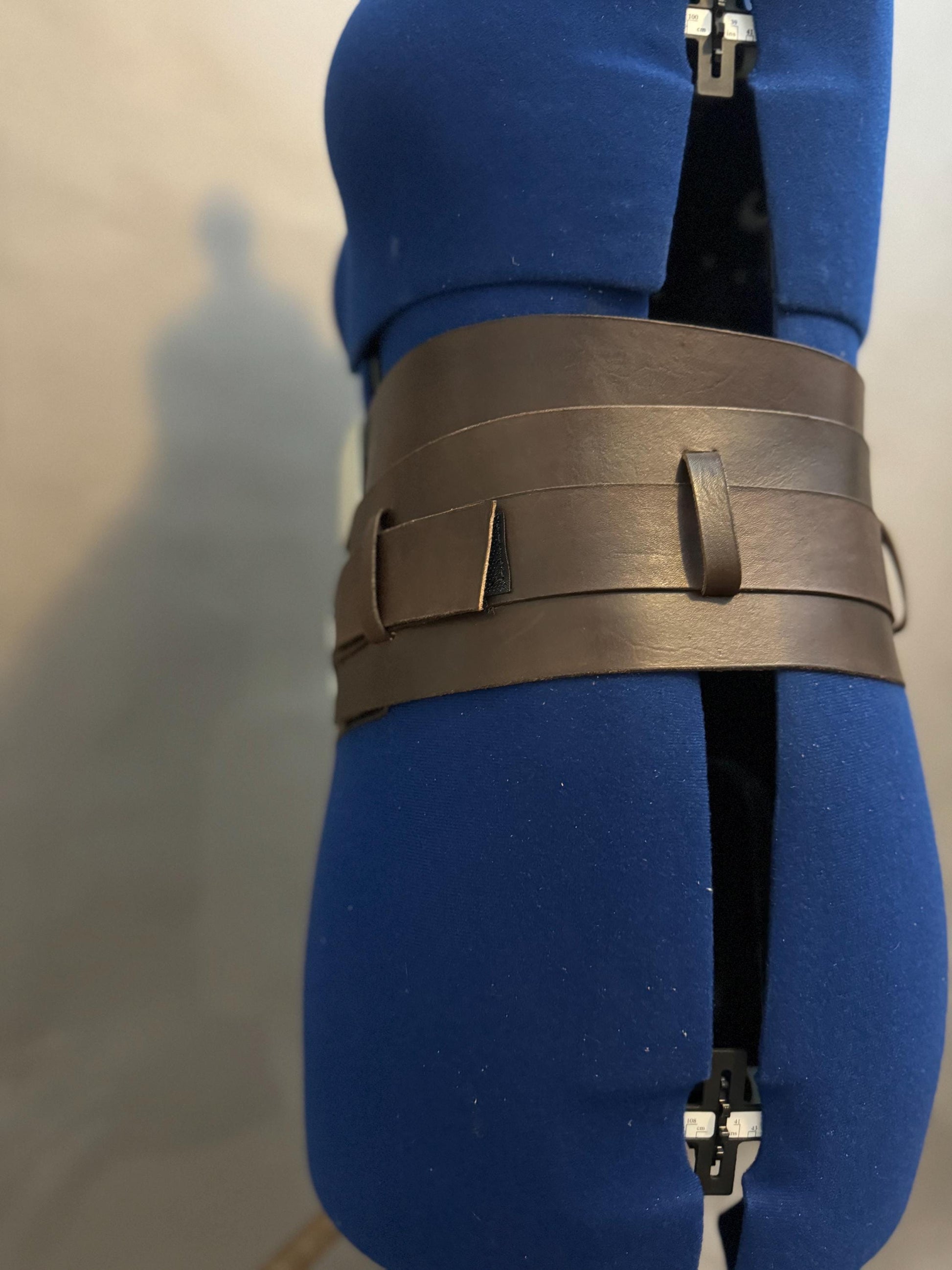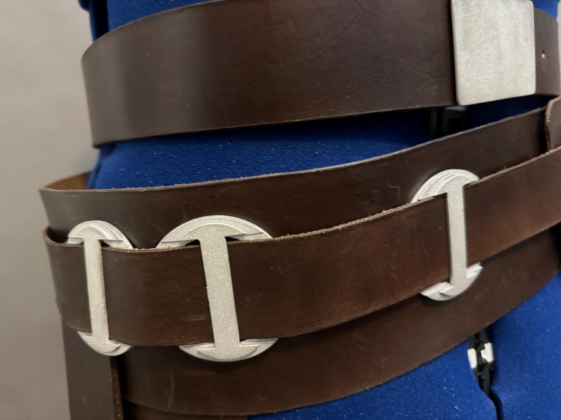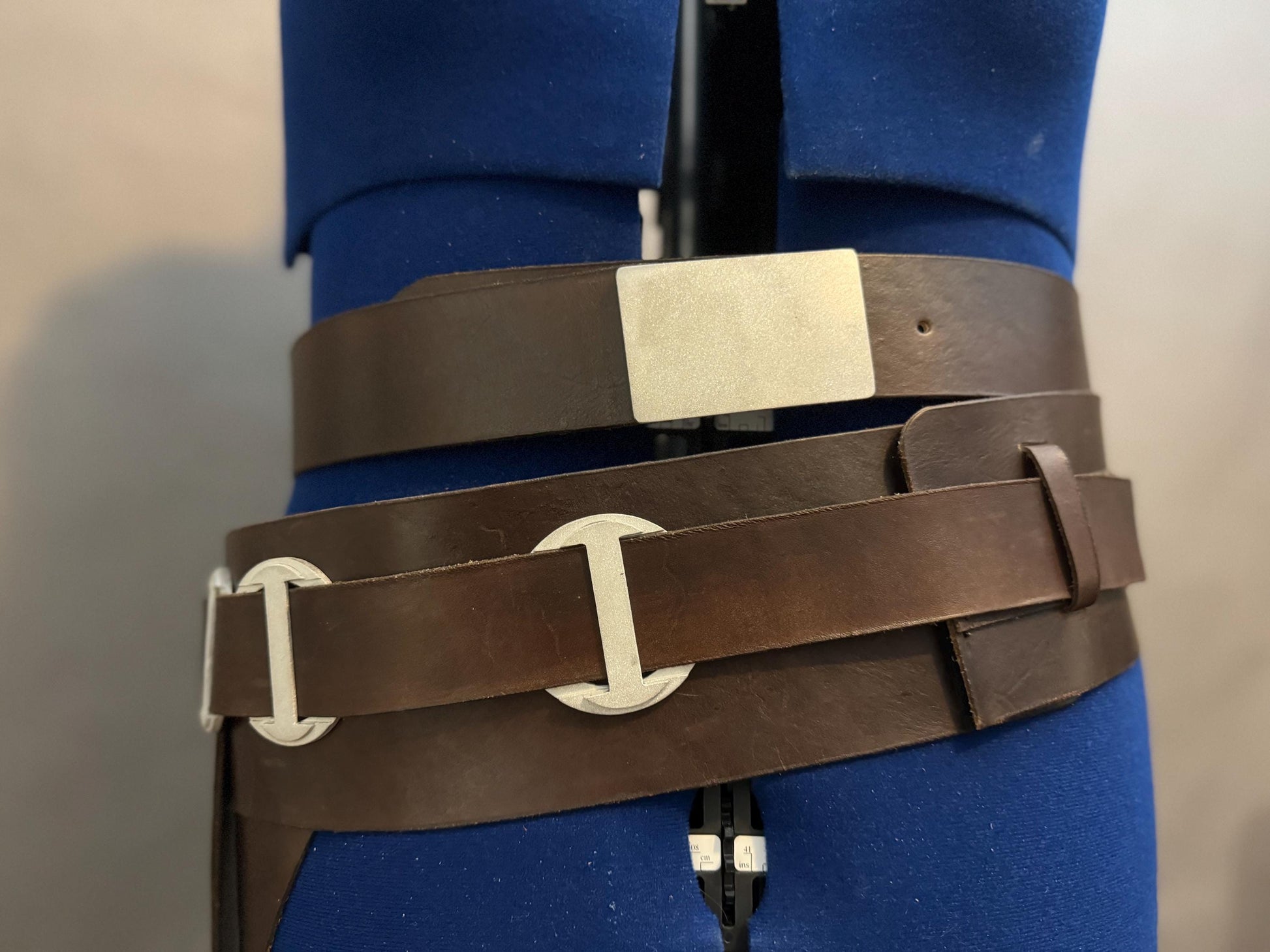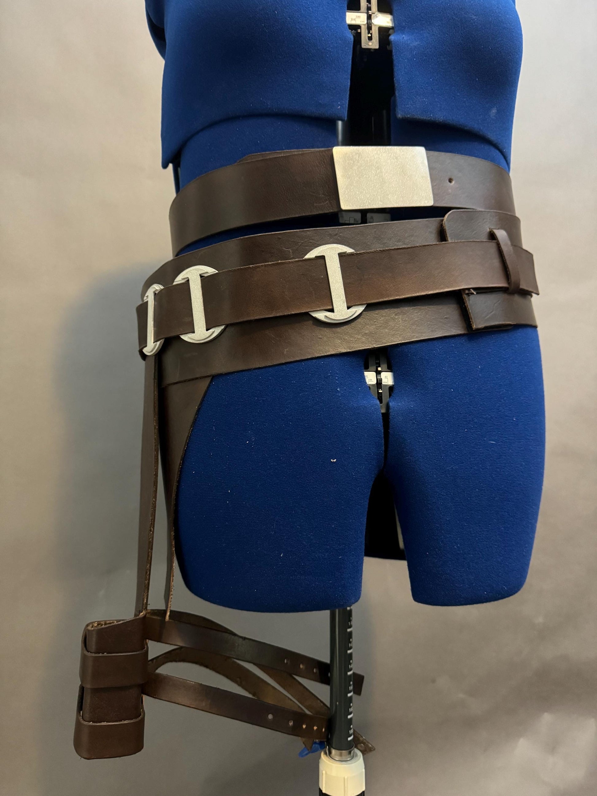Double leather belts featuring custom made metal details and buckle. Holster designed to fit Glie-44 blaster pistol. with thigh straps. Top belt closes with functional metal buckle, and lower hip belt has hidden velcro closure.