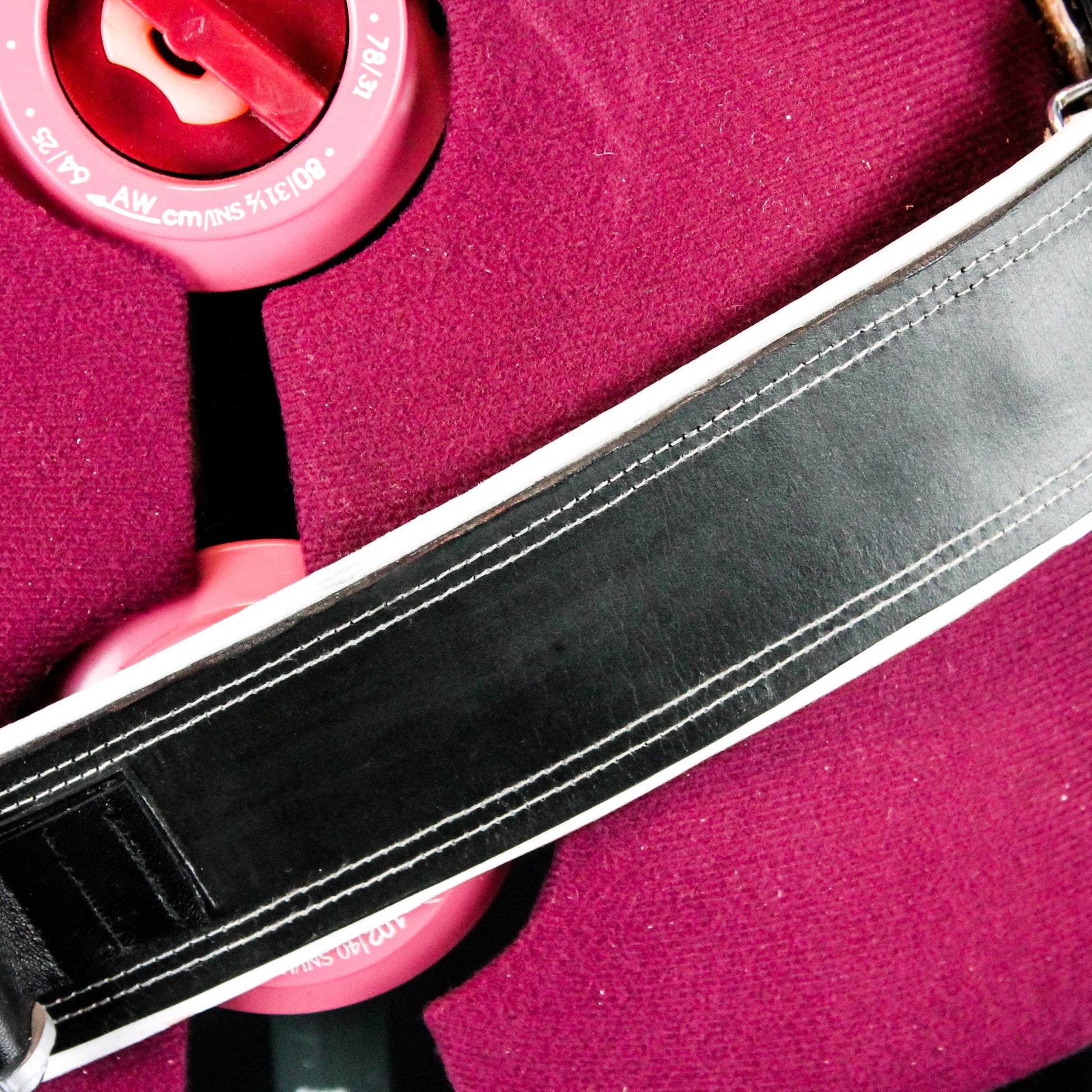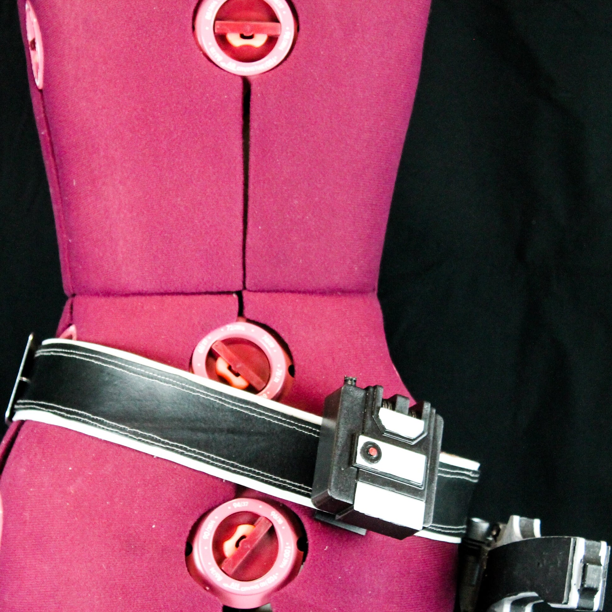 Buckle is functional and real metal, it sits on the left hip of the wearer. Belt is two layers of leather, black over white with 4 rows of accurate white stitching. 4 loops for greeblies. The Holster is securely and invisibly attached.