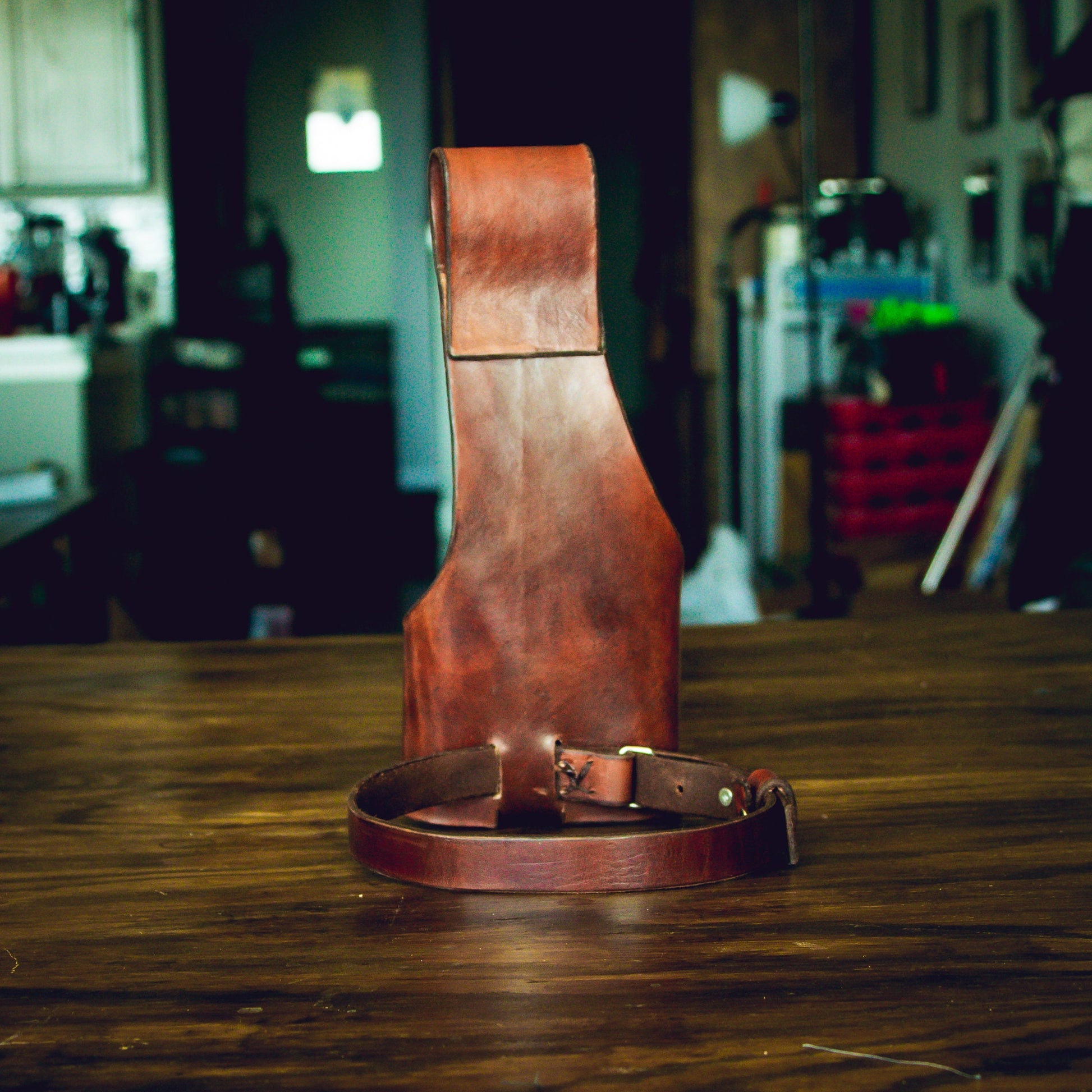 The Belt is hand made from a single piece of Veg Tan leather and wrapped with accurate hemp cord. The wide portion of the belt is designed to sit on the wearer's left hip, while the two separate straps attach around the right side of the body with two pairs of rectangular rings. The belt secures through holes on the back mimicking the screen used one.